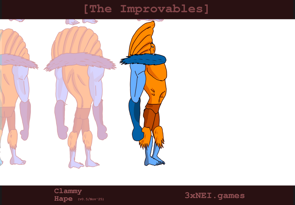 Sprite sheet animation will be handled by moving shapes frame by frame on GIMP, as to avoid skeletal animation stiffness.